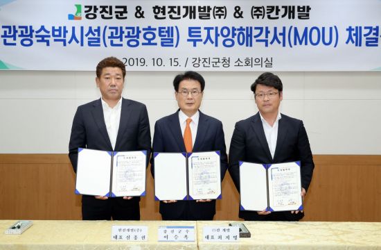 [아시아경제 호남취재본부 서영서 기자] 강진군은 15일 현진개발㈜, ㈜칸 개발과 관광숙박 시설 건립을 위한 투자양해각서(MOU)를 체결했다고 밝혔다.