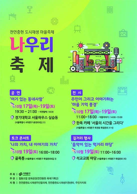 [아시아경제 박종일 기자] 서대문구(구청장 문석진)는 17일부터 19일까지 뉴딜도시재생사업지인 천연충현구역에서 지역주민이 주최하는 도시재생 나우리 마을축제가 열린다고 밝혔다.