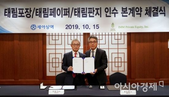 15일 IMM 프라이빗에쿼티(IMM PE)는 태림포장, 태림페이퍼, 태림판지(이하 태림)의 경영권 지분을 세아상역에 매각하는 주식매매계약 체결식을 그랜드인터컨티넨탈서울파르나스호텔에서 진행했다고 밝혔다.