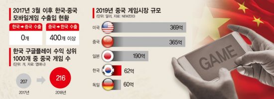 ◆국내 게임 손실 최대 4조원 = 반면 중국 진출길이 막힌 국내 게임업계는 막대한 손실을 감수하고 있는 상황이다. 시장조사업체 뉴주에 따르면 중국의 게임시장은 올해 기준 365억 달러 규모로 369억 달러인 미국과 수위를 다투고 있다. 조경태 자유한국당 의원은 "업계에서는 중국 정부가 판호를 발급하지 않아 국내 게임사가 입은 수출 피해를 2조원에서 4조원으로 추정하고 있다"고 말했다. 2017년 기준 전체 게임 수출의 57.6%를 차지할 정도로 큰 시장에 신규 진출이 차단되면서 막대한 손실을 보고 있는 것이다.