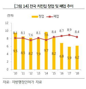 또 KB금융지주 경영연구소 리포트에 따르면 퇴직자들의 주요 창업 아이템인 치킨집은 매년 8000개 이상 문을 닫고 있다. 치킨집 창업은 2014년 9700개에서 2015년 8200개, 2016년 6800개, 2017년 5900개, 지난해 6200개로 감소하는 추세다. 반면 폐업은 2014년 7600개에서 2015년 8400개, 2016년 8700개, 2017년 8900개, 지난해 8400개로 나타났다. 김태환 KB금융지주 경영연구소 연구위원은 "전체 치킨 시장 규모는 성장세를 이어갈 것으로 보이지만 영업이익 하락, 경쟁 심화 등 악화된 영업 여건은 당분간 개선이 어려울 것으로 전망된다"고 밝혔다.
