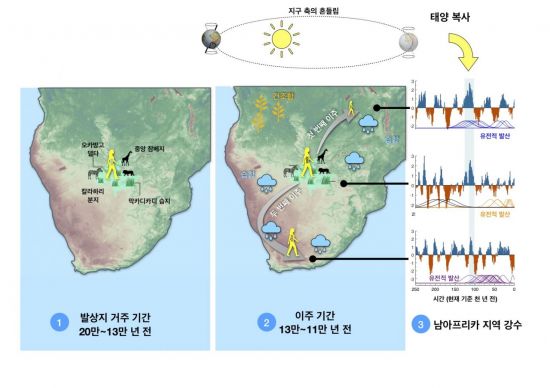 특히 IBS 연구진은 현생인류가 발상지에서 이주한 원인은 지구 자전축 변동으로 인한 아프리카 지역 기후변화 때문이라는 사실도 증명했다. 연구진은 해양 퇴적물 등 고 기후 자료와 기후 컴퓨터 모델 분석으로 지구 자전축의 느린 흔들림이 남반구의 여름 일사량을 변화시켰고 이로 인해 남아프리카 전역의 강우량이 주기적으로 변화했음을 밝혔다. 기후변화로 인해 약 13만 년 전에 발상지 북동쪽, 약 11만 년 전에 남서쪽으로 녹지가 형성돼 이주가 가능한 환경이 갖춰졌다. 이는 유전학적으로 분석한 이주 시기 및 경로와 일치해 현생인류가 기후변화로 인해 이주했음을 알 수 있었다.