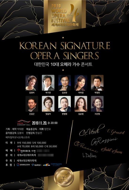 2019년 세계4대오페라축제의 폐막작으로 오는 11월20일 롯데콘서트홀에서 대한민국 10대 오페라가수 콘서트가 개최된다.