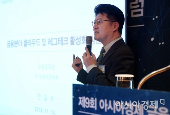 아시아경제와 금융보안포럼 주최로 14일 서울 중구 롯데호텔에서 열린 '제9회 아시아경제 금융 IT포럼'에서 전길수 금융감독원 IT핀테크전략국장이 주제 발표를 하고 있다./김현민 기자 kimhyun81@