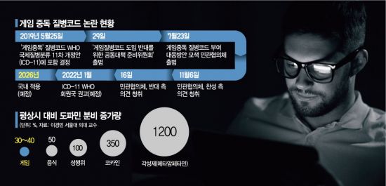 이 교수는 저명한 해외 학술지 네이처에 등재된 논문을 근거로 들었다. 그는 "게임을 할 때 나오는 도파민 분비량은 평소 대비 30~40% 가량 늘어나는데 이는 식사할 때와 비슷한 수준"이라며 "반면 코카인과 같은 마약을 섭취할 때엔 평상시의 350%, 메타암페타민과 같은 각성제를 먹으면 1200% 가량 늘어난다"고 설명했다. 게임을 즐길 때 나오는 도파민 분비는 지극히 정상 수준이며, 이를 마약 중독과 맞먹는다는 주장은 틀렸다는 것이다.