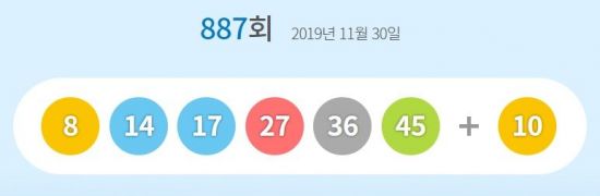 [아시아경제 문채석 기자]로또복권 운영사 동행복권은 제887회 로또복권 추첨에서 '8, 14, 17, 27, 36, 45'가 1등 당첨번호로 뽑혔다고 30일 밝혔다. 2등 보너스 번호는 '10'이다.