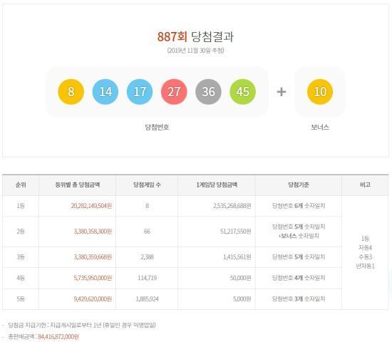 지난달 30일 로또 복권 추첨사 '동행복권'이 추첨한 결과, 로또 당첨번호는 '8, 14, 17, 27, 36, 45'로 결정됐다. 보너스 번호는 '10'이다.