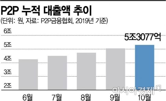 두 달 새 5700억원 넘는 투자금이 들어왔다. 한국P2P금융협회에 따르면 지난 10월 말 기준 누적 P2P 대출액은 5조3077억원으로 집계됐다. 지난 8월 말 4조7358억원에 비해 5719억원 증가했다. 지난 1월 말 3조2928억원과 비교하면 9개월 만에 2조원 넘게 급증했다.