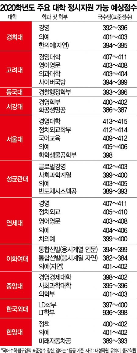 서울 지역 다른 주요 대학들의 합격선은 384점 내외로 전망됐다. 주요 대학의 경영학부에 합격 가능한 점수는 392점 이상이고, 특히 의과대에 가려면 최소 401점은 넘어야 할 것으로 보인다.