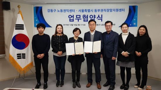 [아시아경제 박종일 기자] 강동구 노동권익센터가 10일 서울특별시동부권직장맘지원센터와 직장맘 노동자들을 위한 권리구제와 교육, 권리지킴이사업 등 노동권익 향상을 위한 업무협약을 체결했다.