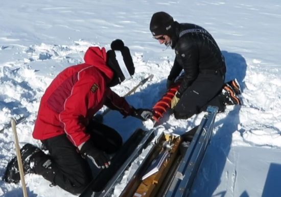 빙하코어를 연구하고 있는 과학자의 모습. [사진=유튜브 화면캡처]