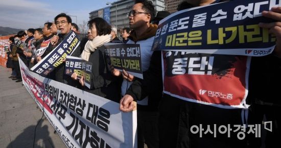 민주노총, 한국진보연대, 민중당 등으로 구성된 민중공동행동 관계자들이 16일 서울 광화문광장 미국대사관 앞에서 '방위비 5차 협상 대응 1박 2일 국민항의 행동단 선포 기자회견'을 하고 있다./김현민 기자 kimhyun81@