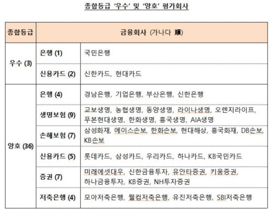 68개사 중 우수 등급은 국민은행, 신한카드, 현대카드가 받았다. 금융소비자보호 모범규준이 요구하는 수준을 상회하는 수준의 경영관리를 수행하고 있어 매우 높은 수준의 소비자보호 달성이 가능하다는 기준을 달성했다.