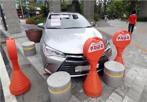 지난해 8월 인천 송도 연수구 모 아파트단지 정문 인도에 50대 여성 주민의 캠리 차량이 방치된 모습. 이 여성은 아파트 단지 주차위반 스티커가 부착된 것에 화가 나 자신의 승용차로 지하주차장 진입로를 막아 물의를 빚었다. [이미지출처=연합뉴스]