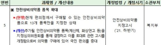 개선안 중 공정위가 소비자 편익이 가장 커질 것으로 예상한 정책은 편의점 판매 안전상비의약품 허용 대상 확대다. 지금은 13개인데 제산제, 화상연고 등을 추가한다. 지정심의위를 통해 결정한 뒤 2021년 하반기에 고시를 개정할 계획이다.