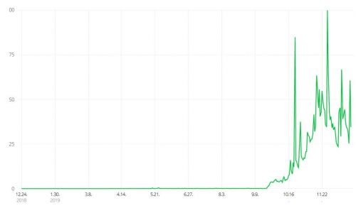 25일 네이버 데이터랩에 따르면, '펭수'라는 키워드로 검색했을 때 최근 1년(2018년 12월24일~2019년 12월24일) 중 11월28일 가장 높은 검색량(100)을 기록했다. 데이터랩 그래프는 네이버에서 해당 검색어가 검색된 횟수를 일별·주별·월별 각각 합산해 조회기간 내 최다 검색량을 100으로 설정한다.