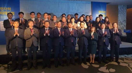 27일 서울 강남구 인터컨티넨탈 서울 코엑스 다이아몬드홀에서 열린 '원자력미래포럼 종합세미나' 참석자들이 손뼉을 치는 모습. 앞줄 왼쪽에서 다섯번째는 주영준 산업통상자원부 에너지자원실장, 앞줄 오른쪽에서 네번째는 최원호 과학기술정보통신부 거대공공연구정책관, 앞줄 왼쪽에서 네번째는 정재훈 한국원자력산업회의 회장.(사진=문채석 기자)