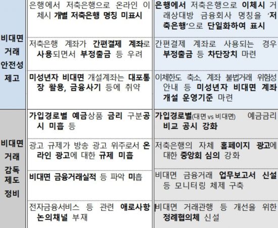 금융당국은 "인터넷ㆍ모바일뱅킹 서비스 개선 및 혁신금융서비스 도입으로 저축은행 영업의 비대면화가 더욱 가속화될 전망"이라면서 "비대면 거래관행과 제도 개선을 통해 비대면 거래의 편의성과 안전성을 높여 저축은행의 건전한 성장을 뒷받침하겠다"고 말했다.