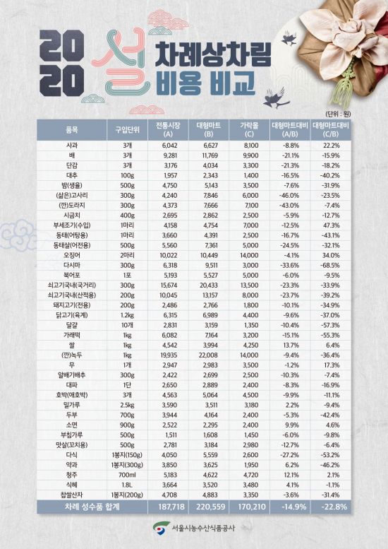 서울시농수산식품공사, 서울 전통시장 50곳?대형마트 25곳?가락시장(가락몰) 설 차례상차림 비용 조사 발표(간소화 기준)... 구매비용(6~7인 가족 기준)은 전통시장 평균 18만7718원, 대형마트 평균 22만559원으로 전통시장이 대형마트보다 15% 저렴