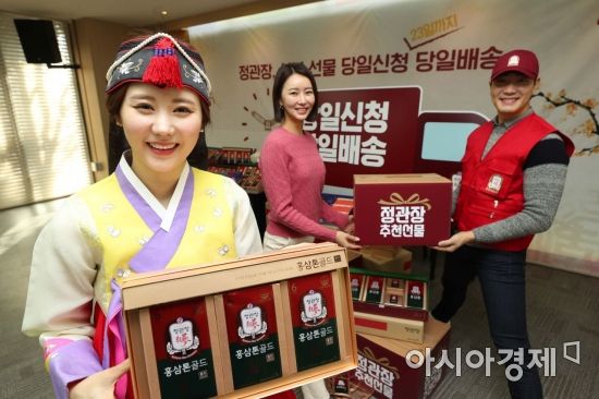 KGC인삼공사 정관장 홍보 도우미들이 21일 서울 중구 한국의집에서 설날 선물 '당일신청·당일배송' 서비스를 알리고 있다. /문호남 기자 munonam@