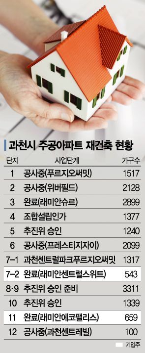과천시내 아파트 중 재건축을 마무리한 단지는 세곳이다. 11단지가 '래미안에코팰리스', 3단지 '래미안슈르'가 2007~2008년 가장 먼저 사업을 마무리했으며 2018년에는 7-2단지(래미안과천센트럴스위트)가 입주를 마쳤다. 2단지(과천위버필드), 6단지(과천프레스티지자이), 7-1단지(과천센트럴파크푸르지오써밋), 12단지(과천센트레빌)는 분양ㆍ입주 단계다. 현재 4ㆍ5ㆍ10단지 는 추진위ㆍ조합설립 단계로, 8ㆍ9단지만 유일하게 추진위 설립이 이뤄지지 않았다.