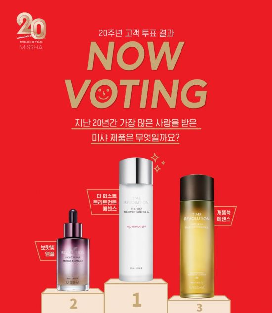미샤는 공식 홈페이지 뷰티넷을 통해 지난달 13일부터 약 2주간 제품 투표 이벤트를 진행했다. 20년간 가장 사랑받은 제품을 선발하는 ‘러뷰 부문’과, 지금은 단종됐지만 추억의 인기 제품을 선정하는 ‘미슈 부문’으로 4726명이 투표에 참여했다.