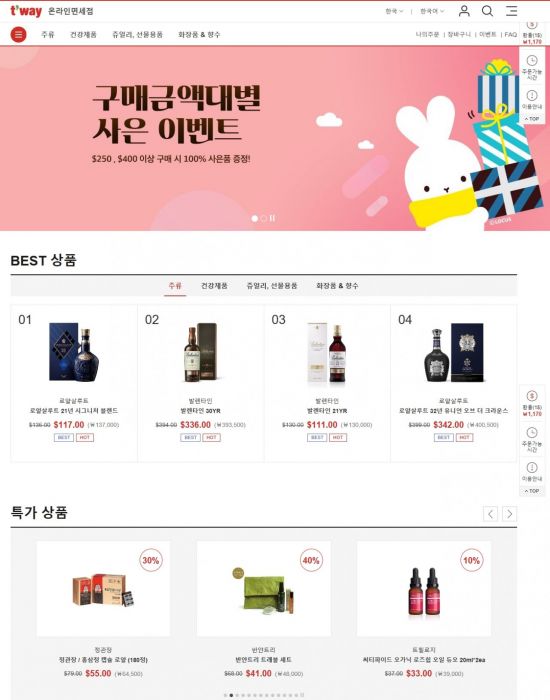 또 발렌타인 30년 등 베스트셀러 면세품에 한해 할인이벤트도 시행된다. 면세품 결제 및 수령일 기준 29일까지 베스트셀러 품목에 한해 1개 구매시 15%, 2개 구매시 두번째 품목은 최대 50%의 할인이 적용된다.