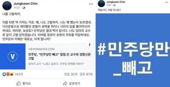 [아시아경제 윤신원 기자] 더불어민주당이 당에 대한 비판적인 칼럼을 쓴 임미리 고려대 연구교수와 이를 신문에 실은 경향신문을 검찰에 고발한 것과 관련해 정치권은 물론 일반 시민들 사이에서도 비판이 거세지고 있다.