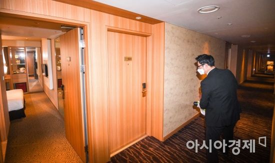 14일 서울 중구 서미트호텔에서 호텔 직원이 객실 내부 및 복도 방역을 하고 있다./강진형 기자aymsdream@