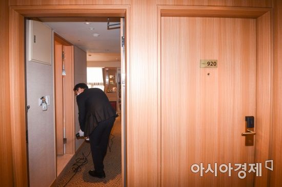 14일 서울 중구 서미트호텔에서 호텔 직원이 객실 내부 및 복도 방역을 하고 있다./강진형 기자aymsdream@