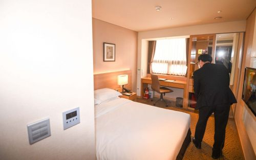 14일 서울 중구 서미트호텔에서 호텔 직원이 객실 내부 및 복도 방역을 하고 있다./강진형 기자aymsdream@