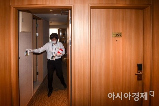 14일 서울 중구 서미트호텔에서 호텔 직원이 객실 내부를 방역하고 있다./강진형 기자aymsdream@
