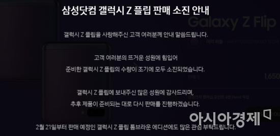 [아시아경제 한진주 기자] 갤럭시Z 플립 판매가 시작되면서 국내외에서 품절행렬이 잇따르고 있다.