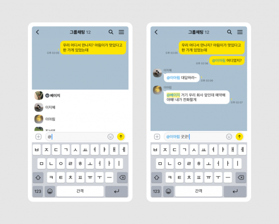 입력창에 '@'를 치면 아랫부분에 해당 채팅방 이용자들이 쫙 노출된다. 이중 원하는 상대를 골라 메시지를 보내면 된다.