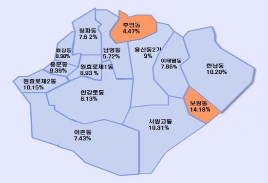 특히 개발사업이 활발히 진행 중인 한남3재정비 촉진지구는 16.75% 상승한 것으로 나타났다. 동별로는 보광(14.18%), 서빙고(10.31%), 한남동(10.20%) 상승률이 가장 높았다. 모두 한남재정비 촉진지구를 포함한 곳이다.