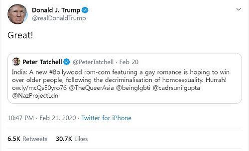 트럼프 대통령은 21일(현지시간) 동성애 인권운동가 피터 태첼이 "발리우드의 새로 나온 게이 로맨스 영화가 동성애 처벌 폐지에 이어 구세대를 이기길 희망한다"고 적은 트윗을 리트윗하며 "훌륭하다"고 말했다.