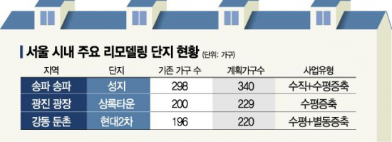 서울시가 안전진단 등 비용 일부 지원과 빠른 인허가를 내건 '서울형 리모델링'을 추진하는 등 당국에서도 리모델링 사업을 장려하는 모양새이지만 걸림돌도 있다. 수직증축 문제가 대표적이다. 2014년 주택법 개정을 통해 최대 3개 층까지 수직증축을 통한 수익성 확보가 허용됐지만 지금까지 수직증축 사업계획이 통과된 단지는 송파구 송파동 성지아파트 단 한 곳에 불과하다.