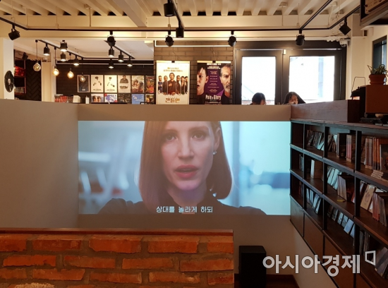 이곳을 방문했던 지난 19일에는 요르고스 란티모스 감독의 '더 랍스터(The Lobster, 2015)'가 상영되고 있었다. '더 랍스터'가 끝난 후에는 제시카 차스테인 주연의 '미스 슬로운(Miss Sloane, 2016)'이 상영됐다. 상영작이나 시간이 고정돼 있지 않은 것이 여기만의 장점이다. 날씨에 따라 어울리는 영화를 상영하기도 하고, 카페를 방문한 사람들의 요청을 받아 영화를 틀어주기도 한다. 이곳에 마련된 블루레이(Blu-ray Discㆍ기존 DVD보다 영상과 음향의 품질을 높인 휴대용 저장매체) 중 원하는 작품이 있다면 누구든 상영을 요청할 수 있다. 가끔은 직접 보고 싶은 영화 블루레이를 가져오는 관객들도 있어 부탁을 받아 상영을 진행하기도 한다.