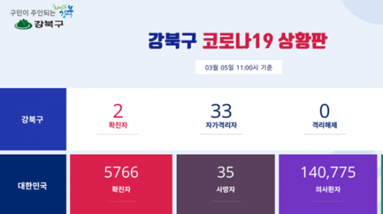 강북구청은 5일 공식 홈페이지 상황판을 통해 강북구에서 2명의 확진자가 나왔다고 밝혔다.