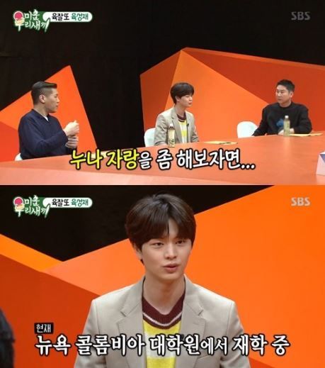 이어 육성재는 친누나에 대해 언급했다. 그는 "누나 한 명이 있다. 누나랑 닮았다. 누나가 하관은 날 닮고 위에는 엄마를 닮았다. 쌍꺼풀이 짙다. 자랑을 해보면 뉴욕 콜롬비아 대학원에 다닌다. 키가 170cm의 장신이다. 1992년생이니까 현재 29살"이라고 했다.