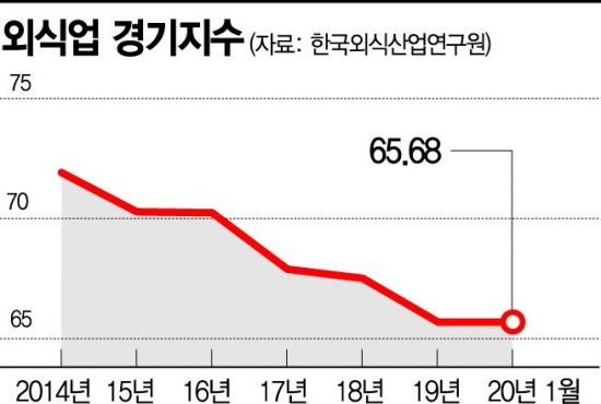 음식점을 운영하는 소상공인과 전통시장 내 음식점업을 하는 자영업자들의 1월 시장경기동향은 각각 60.9, 62.4로 집계됐다. 100 초과이면 호전이지만 100 미만이면 악화다. 특히 전통시장 내 음식점업을 운영하는 자영업자들의 상황이 심각하다. 2014년 68.3, 지난해 12월 67.3과 비교하면 급락이나 마찬가지다.