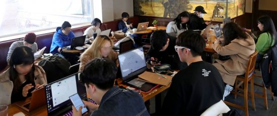 신종코로나바이러스 감염증(코로나19) 확산 예방을 위해 서울 주요대학이 온라인 강의를 실시한 지 이틀 째인 지난 17일 오후 서울 마포구 홍익대학교 인근 한 카페에서 대학생 및 시민들이 시간을 보내고 있다/사진=연합뉴스