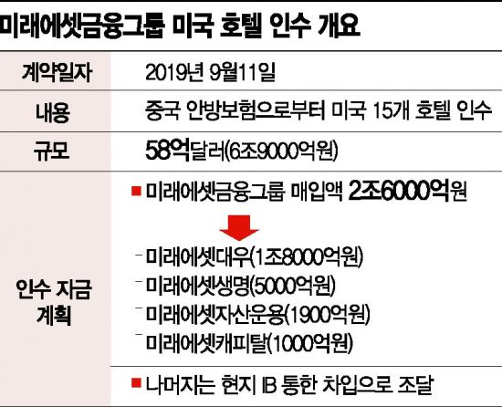 25일 투자은행(IB) 업계에 따르면 미래에셋은 작년 9월 중국 안방보험으로부터 6조9000억원에 인수하기로 한 미국 15개 호텔 인수를 올 상반기 말까지로 연기했다. 당초 이달 말까지 인수 잔금 납입을 마쳐 거래를 완료할 것으로 계획했지만, 호텔 인수에 필요한 자금조달을 놓고 난항을 겪으면서 딜클로징(거래 완료) 연기가 불가피해졌다.