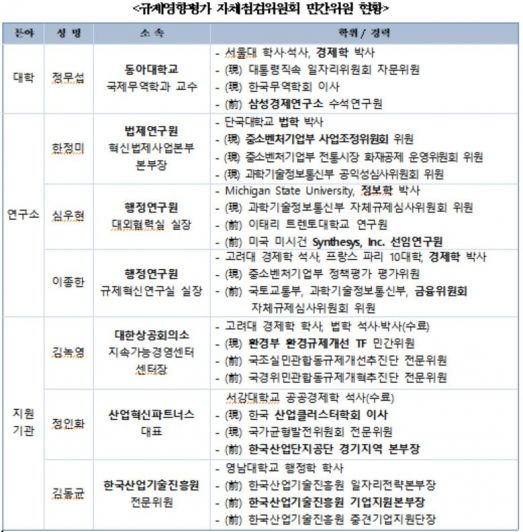 정무섭 동아대 국제무역학과 교수, 한정미 한국법제연구원 혁신법제사업본부 본부장, 심우현 한국행정연구원 대외협력실 실장, 이종한 한국행정연구원 규제혁신연구실 실장, 김녹영 대한상공회의소 지속가능경영센터 센터장, 정인화 산업혁신파트너스 대표, 김동균 한국산업기술진흥원 전문위원 등 규제영향평가 자체점검위원회 민간위원 7명을 위촉했다. 임기는 2년이다.