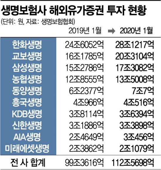 2일 생명보험협회에 따르면 국내 24개 생보사의 외화유가증권 투자규모는 지난 1월 기준 112조5698억원으로 전년 동월 99조3616억원 보다 무려 13.3%나 급증했다.