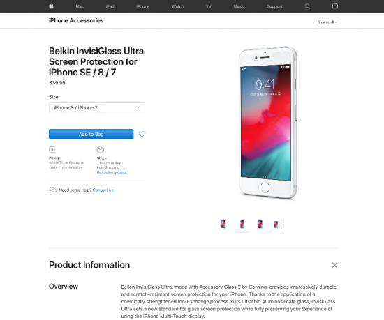 2일(현지시간) 애플은 공식 홈페이지 액세서리 판매 페이지에서 벨킨의 4.7인치 아이폰 액정 보호 필름 제품에 '아이폰 SE/8/7용'이라며 아이폰SE라는 제품명을 노출시켰다. 출시를 앞둔 중저가 아이폰은 아이폰7과 아이폰8과 동일한 4.7인치라는 점을 확인시켜준 것이다. 현재는 해당 게시물에서 아이폰SE라는 이름은 지운 상태다.