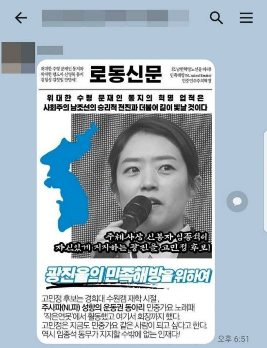 이어 "고민정 후보는 경희대 수원캠 시절, 주사파(NL) 성향의 운동권 동아리 민중가요 노래패 '작은연못'에서 활동했고, 여기서 회장까지 했다. 고민정은 지금도 민중가요 같은 사람이 되고 싶다고 한다. 역시 임종석 동무가 지지할 수 밖에 없는 인재다!"라고 적혀있다.