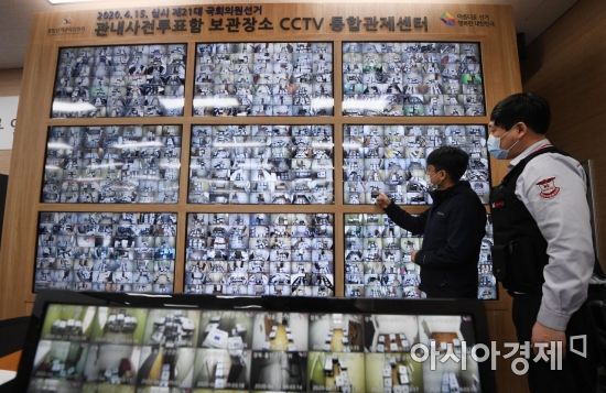 제21대 국회의원선거를 이틀 앞둔 13일 경기 과천 중앙선거관리위원회 관내사전투표함 보관장소 CCTV 통합관제센터에서 관계자들이 업무를 보고 있다./과천=김현민 기자 kimhyun81@