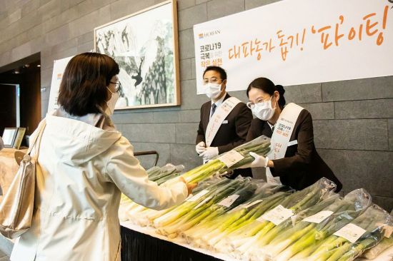 ▲호반그룹은 신종 코로나바이러스감염증(코로나19)로 어려움에 처한 대파 농가를 돕기 위한 '파'이팅 캠페인을 진행했다. 호반그룹 계열 호반호텔&리조트 소속 포레스트 리솜에서 내방객들에게 대파를 나눠주고 있다. (제공=호반그룹)