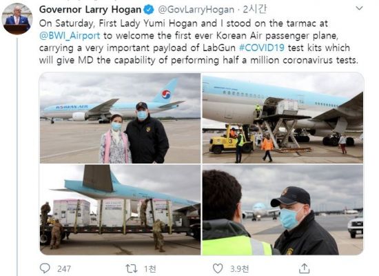호건 주지사는 "한국에서 날아온 진단키트 덕에 메릴랜드 주에서 50만건 이상의 코로나19 진단이 가능해 졌다"고 감사의 뜻을 전했다.